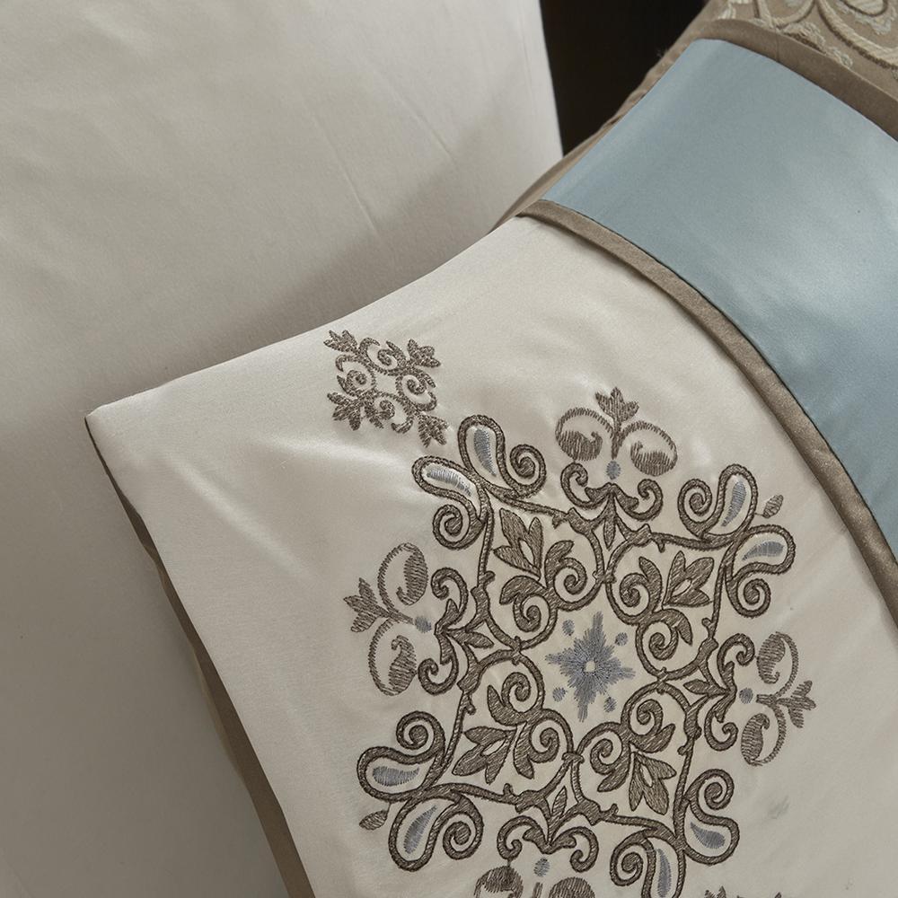 For style and comfort, update your bedroom with the Madison Park Caroline 7 Piece Comforter Set. The jacquard woven comforter is featured with an elegant paisley pattern in a soft color palette of blue, brown, and ivory. The intricate design is separated by brown piping and two blue strips with three beautifully embroidered medallions stitched onto the ivory center. A solid brown reverse provides a pleasant neutral touch, while coordinating shams mirror the stylish motif seen on the top of the bed. Three decorative pillows use fabric manipulation and embroidered details to add texture and charm. An included brown bed skirt give the comforter set a truly finished look.