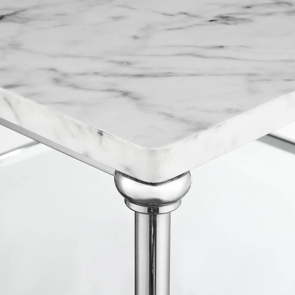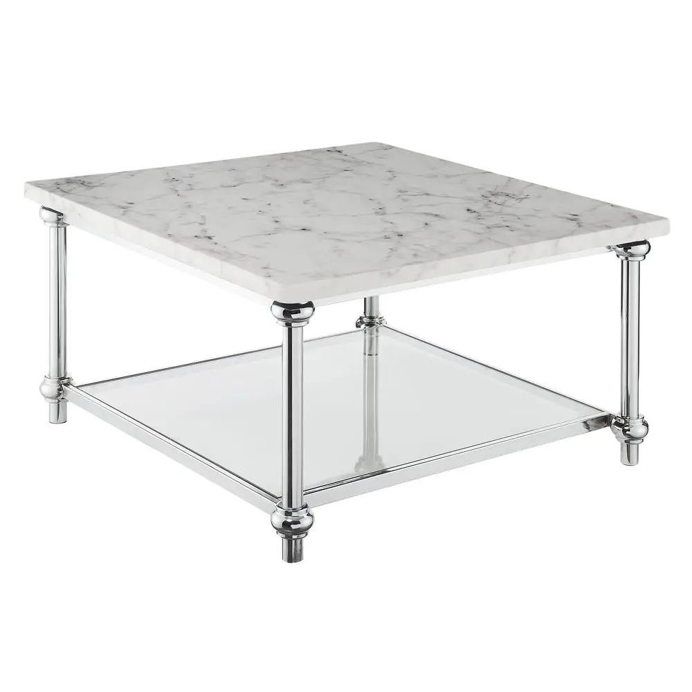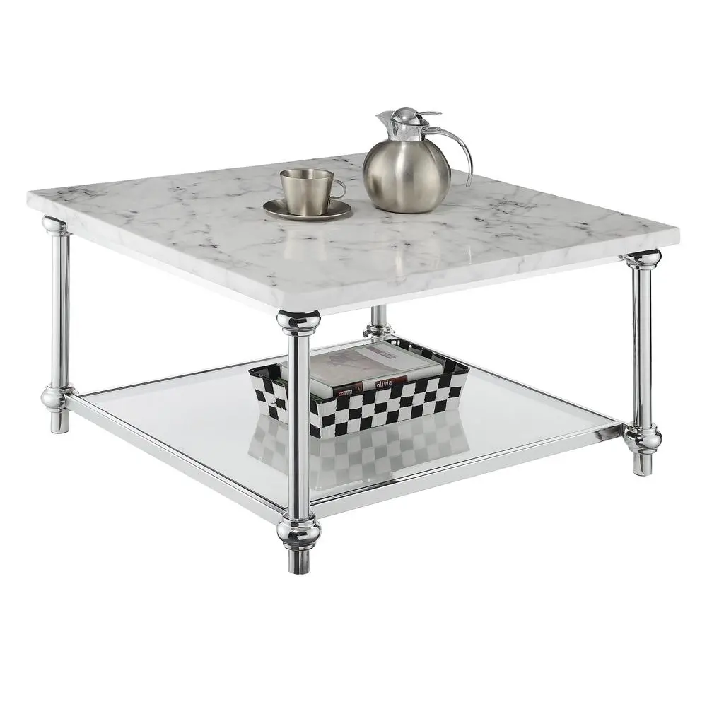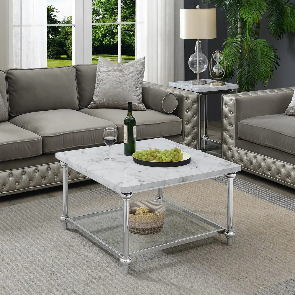 Invite over your friends and family for a small gathering and witness as they become mesmerized by the Roman II Square Coffee Table by Convenience Concepts. They will all want to know where such a beauty came from. The ample white faux marble tabletop along with the clear tempered glass bottom shelf held together by a chromed metal frame; creates a noteworthy contrast. With a modern glam style; this accent piece will add to the sophistication of your current ensemble. Its functionality is not limited to living rooms as this two tier unit offers plenty of storage and display space for your home office or den. Bring home today and enjoy it in no time as this furniture offers a clear and simple 5 step assembly. Looking for more glamourous items? Look no further and complete the look today with the Roman II End Table by Convenience Concepts. Each sold separately.