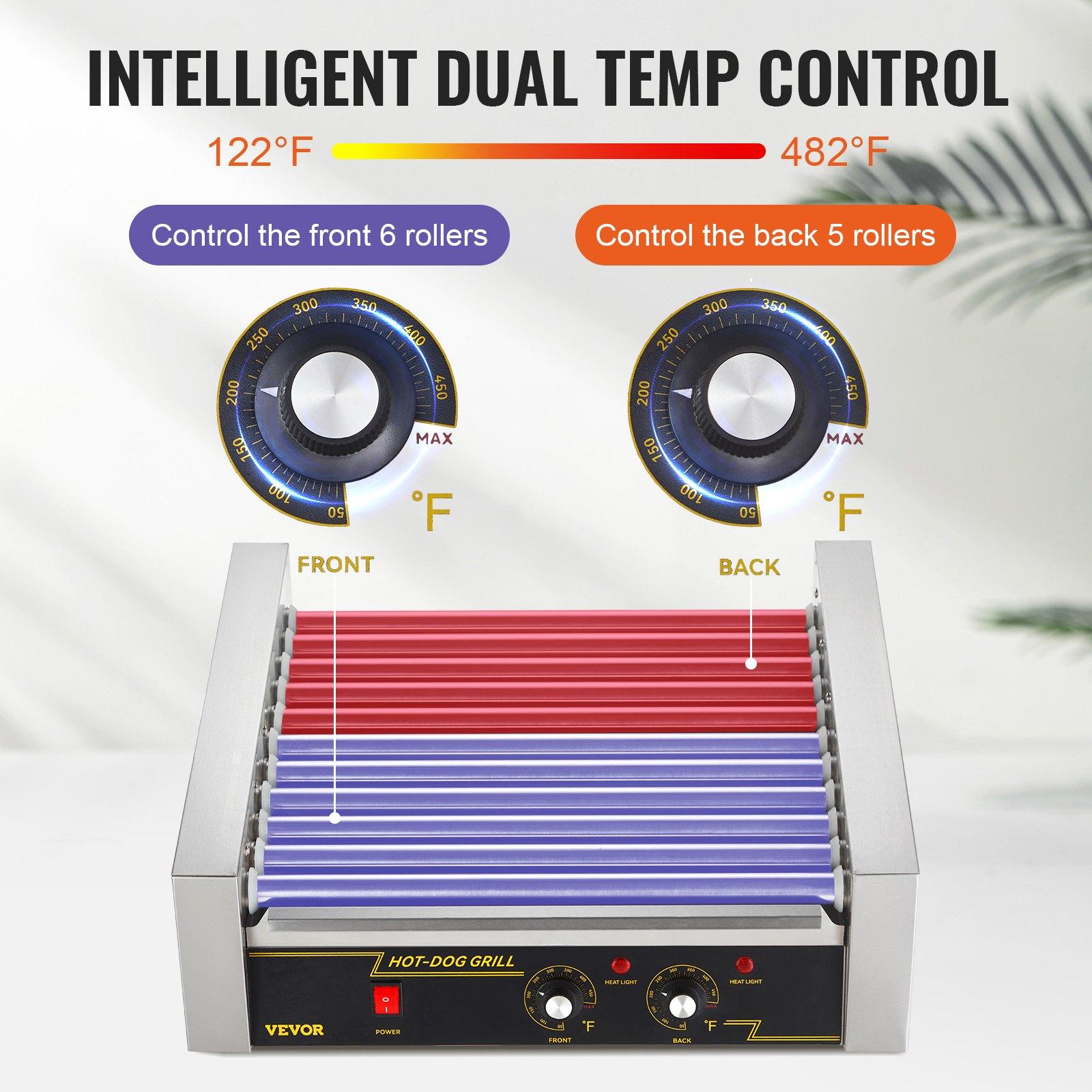 VEVOR Hot Dog Roller, 11 Rollers 30 Hot Dogs Capacity, 1650W Stainless Sausage Grill Cooker Machine with Dual Temp Control Glass Hood Acrylic Cover Bun Warmer Shelf Removable Drip Tray, ETL Certified